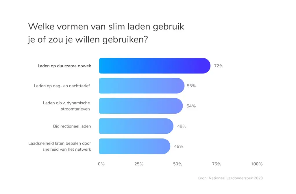 Wat opvalt is dat sturen op duurzaam opgewekte energie de meest gewenste vorm van slim laden is. 72% van de respondenten doet dit al of wil dit graag. Ter vergelijking: slim laden op basis van dynamische stroomtarieven of dag- en nachttarieven wordt door respectievelijk 54% en 55% genoemd.